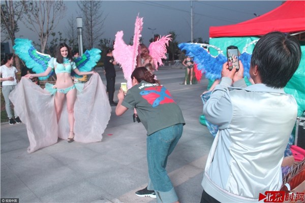 由于维密装扮较大,模特们索性来到换衣间外更换。脱下便装后,身上只剩下乳罩和内裤的模特们迅速被市民围观拍照,其中不乏岁数较大的老者。