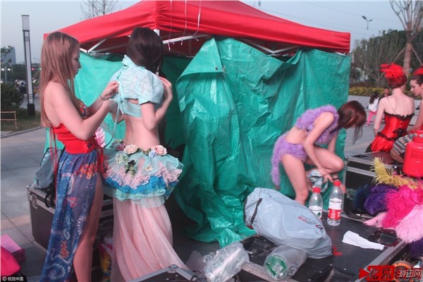 一名洋模刚刚脱下便装时,发现有市民在围观拍照,她便用一口流利的汉语说,“请别拍照,我们在换衣服。”看到别人不再拍照时,这名洋模又十分礼貌地说了句“谢谢”。