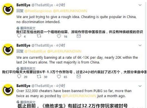 《绝地求生:大逃杀》官方反作弊系统BattlEye前几日在推特上发表:截止至今官方已经封掉的作弊账号超过三十二万个,其中大部分都是中国的帐号!